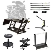 Each kit features a robust lift table, wheel balancer, center jack, shop light, and tie-down straps, ensuring safe and efficient service for your motorcycle right at home.